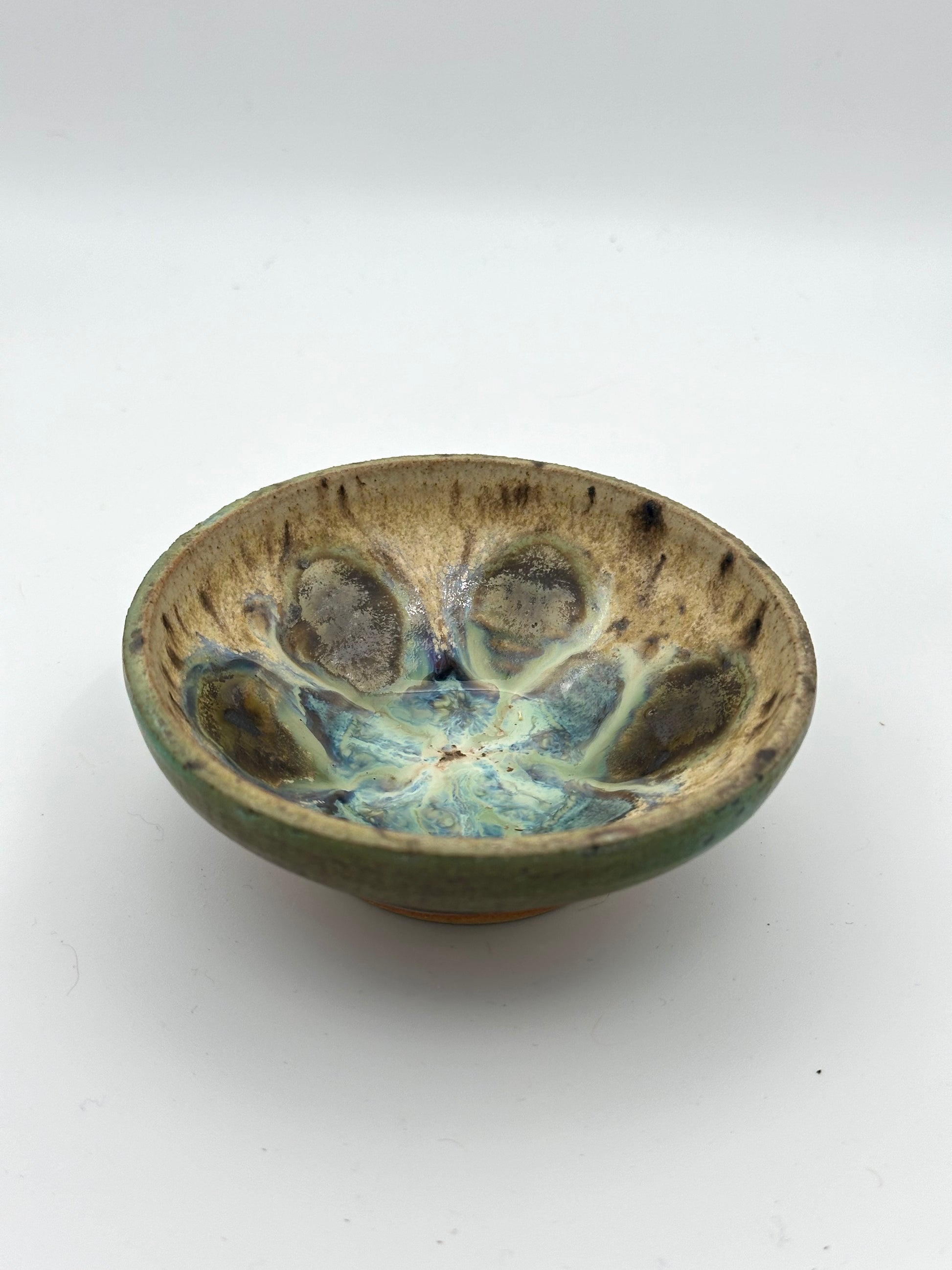 Each of these bowls is handthrown and carefully painted with layered glazes to create the peacock-like effect. Each piece is completely unique and cannot be replicated. This listing is for the specific items shown.