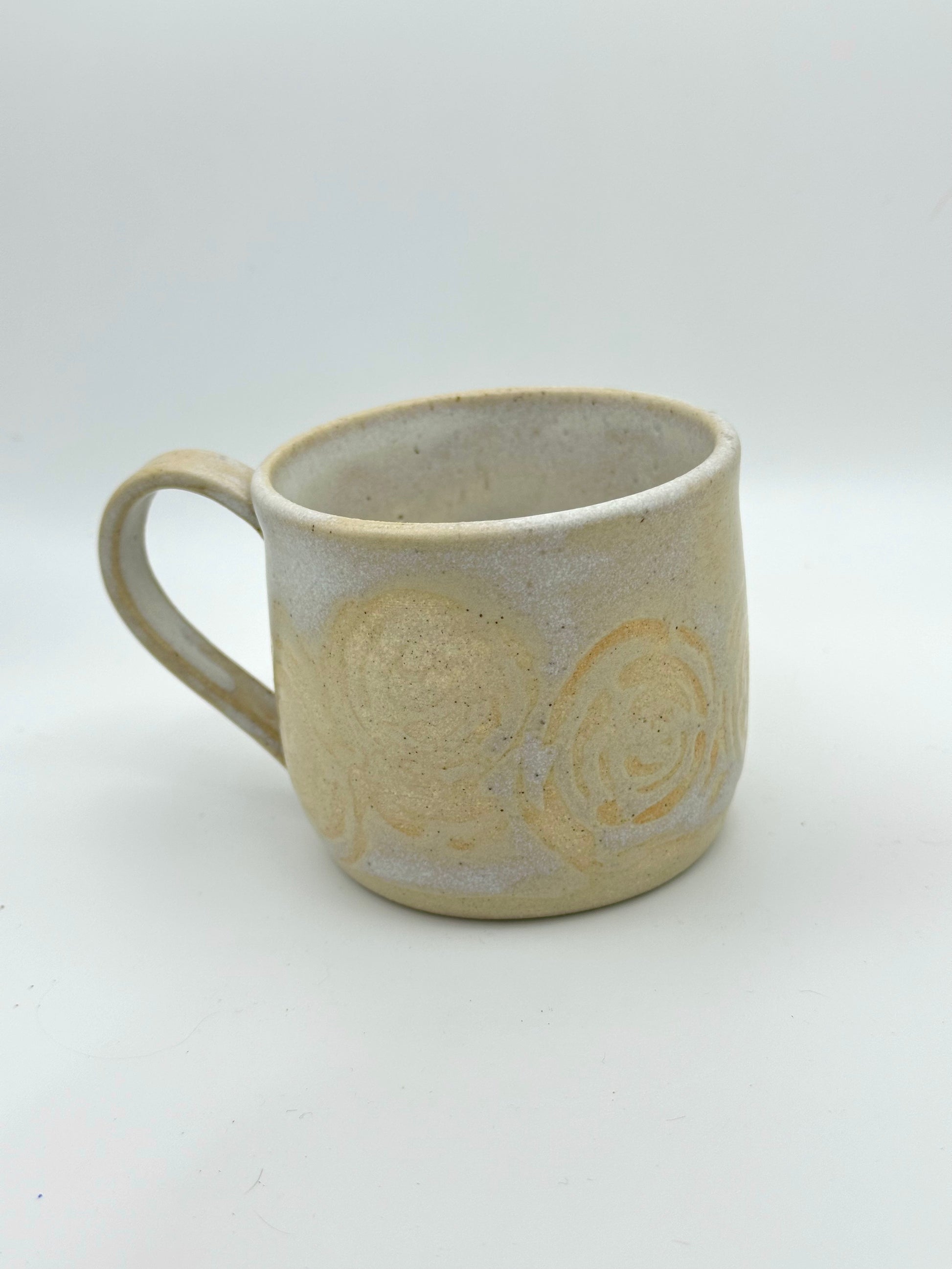 A beautiful handthrown stoneware mug, decorated with a wax resist technique and matte white glaze with blue accents.